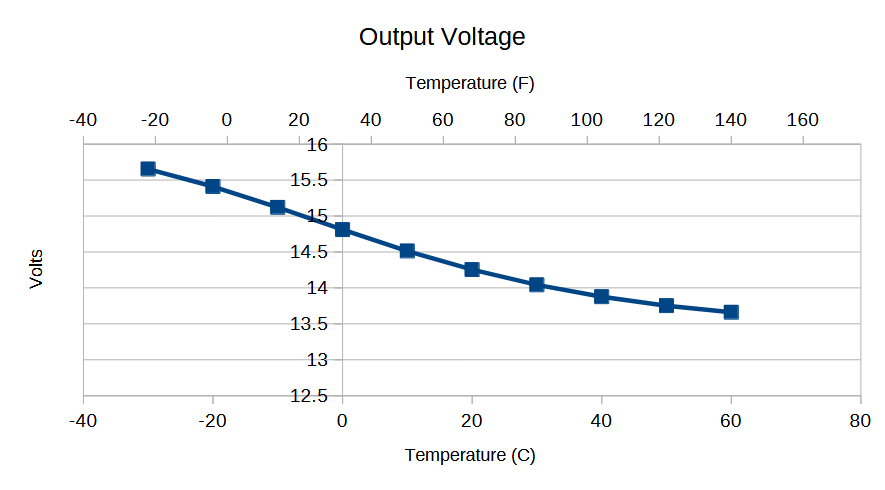 The temperature correction on this regulator is a bit aggressive to match battery manufacturers' recommended charging voltages. If you are relocating the battery to the trunk, we recommend also mounting the regulator in the truck so it can track with the battery temperature more accurately.